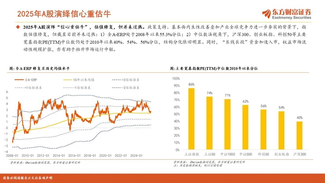 2025年中国股市演绎“信心重估牛”,市场重估科技G2与国际化背景下的中国股市,估值有所修复,但并未过热。2025年A股盈利结束2022-2024年的下行周期,盈利不再低于市场预期,出现筑底回暖迹象,景气线索占比明显提升。