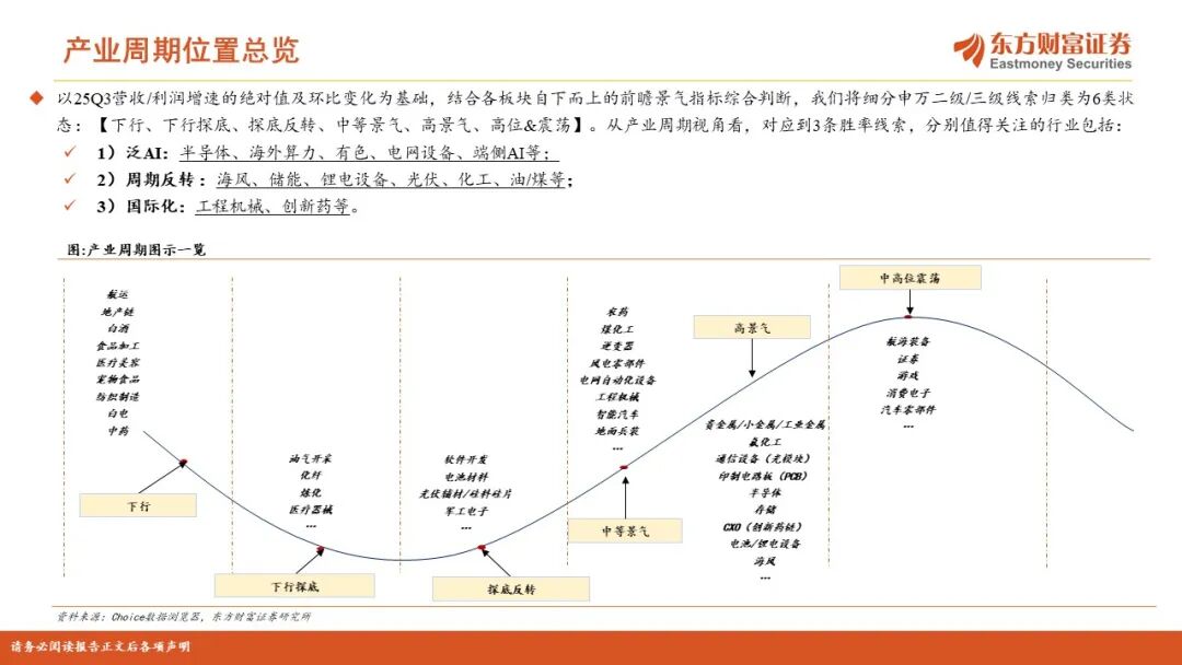 以当前营收/利润增速的绝对值及环比变化为基础,结合各板块自下而上的前瞻景气指标综合判断,我们将细分申万二级/三级线索归类为6类状态:【下行、下行探底、探底反转、中等景气、高景气、中高位震荡】。从产业周期视角看,对应到3条中观胜率线索,分别值得关注的行业包括:1)泛AI:半导体、海外算力、有色、电网设备、端侧AI等;2)周期反转:海风、电池、锂电设备、光伏、 化工、油/煤等;3)国际化:工程机械、创新药等。