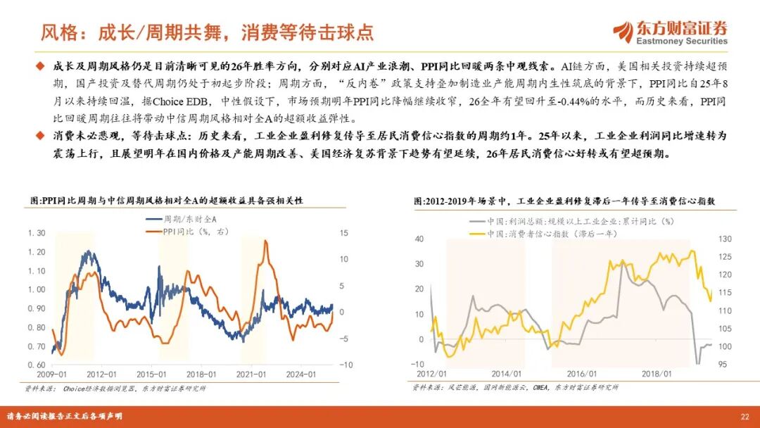 成长及周期风格仍是目前清晰可见的2026年胜率方向,分别对应AI产业浪潮、PPI同比回暖两条中观线索。AI链方面,美国相关投资持续超预期,国产投资及替代周期仍处于初起步阶段;周期方面,“反内卷”政策支持叠加制造业产能周期内生性筑底的背景下,PPI同比自25年8月以来持续回温,中性假设下,市场预期明年PPI同比降幅继续收窄,26全年有望回升至-0.44%的水平,而历史来看,PPI同比回暖周期往往将带动中信周期风格相对全A的超额收益弹性。