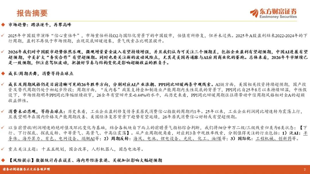 2026年我们对中国股市趋势依然乐观,微观增量资金流入有望持续增强,并且我们认为可关注三个预期差,包括企业盈利有望超预期,中国AI进展有望超预期,中美扩大“务实合作”有望超预期。同时也要关注新的波动风险点,尤其是美国再通胀与AI应用商业化的赛跑。总体来看,2026年牛市继续已是一致预期,但注意驾驭波动,把握好节奏与结构变化是影响超额收益的胜负手。